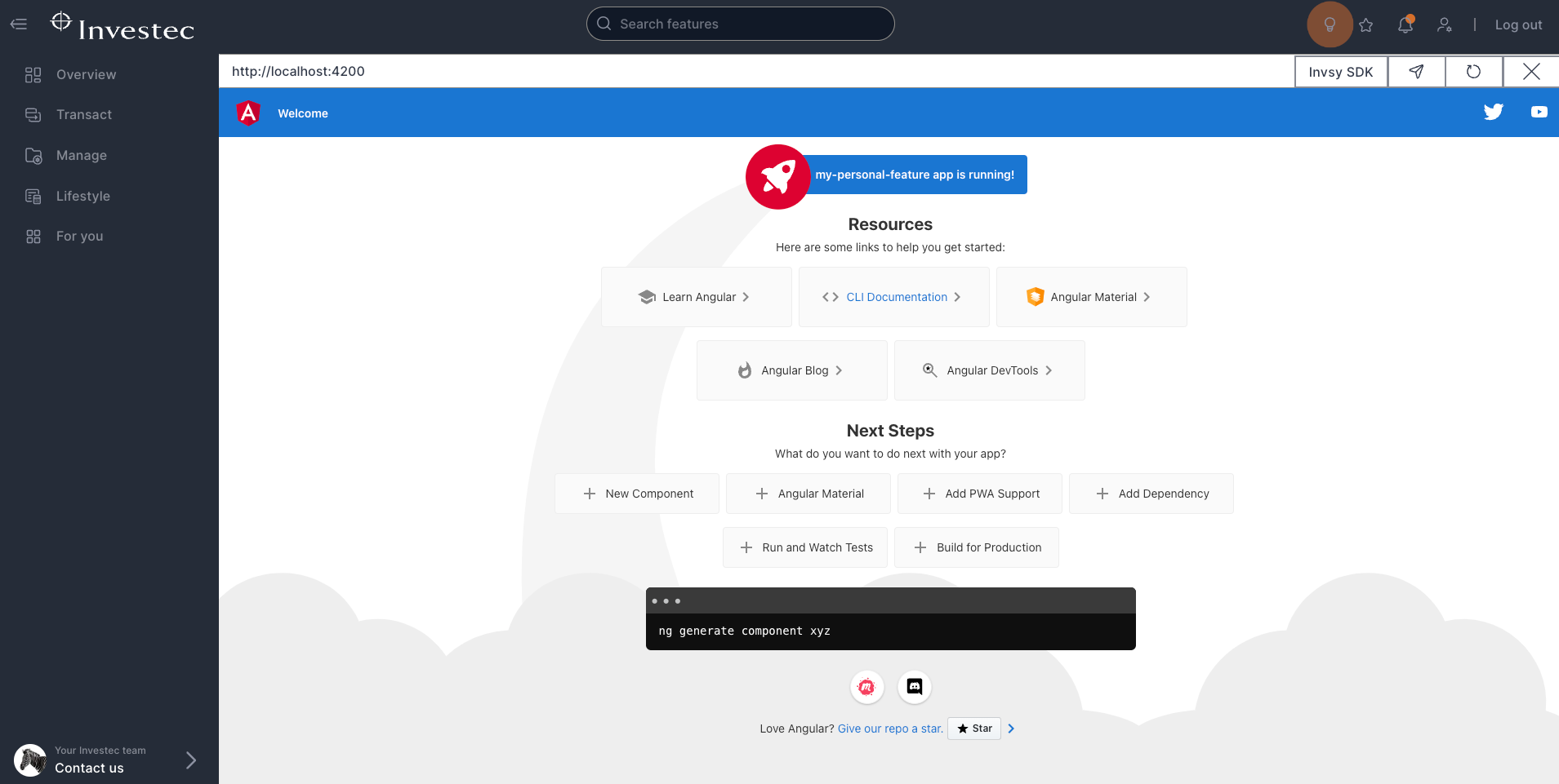 vue create hello-worldvue create hello-worldPersonal Features are not limited to the above-mentioned frameworks and libraries. Any web application can be used as a personal feature and run in Investec Online and the mobile app.
